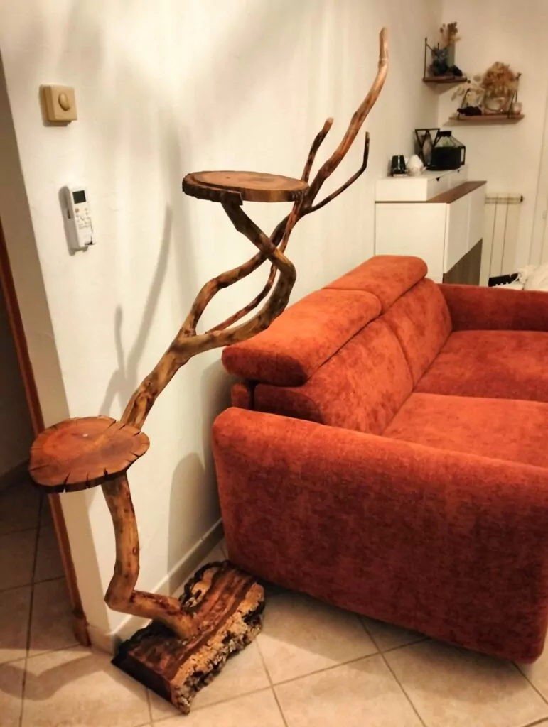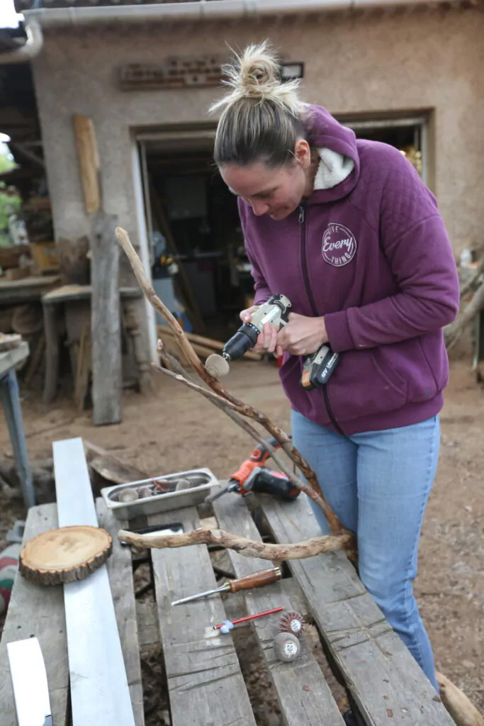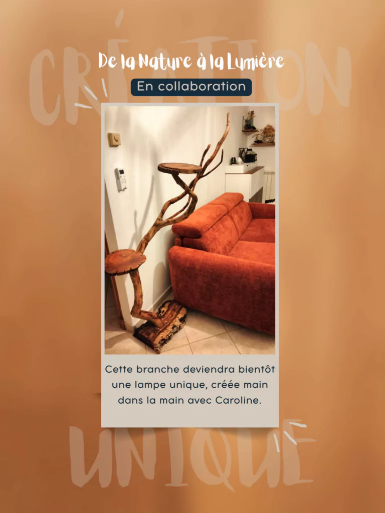 Elle est venue avec une magnifique branche de bois flotté, chargée de caractère et d’histoire. Ensemble, nous avons imaginé et construit une lampe entièrement personnalisée :